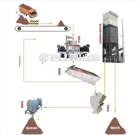 物料首先從原料倉(cāng)經(jīng)過(guò)電子秤進(jìn)入到皮帶輸送機(jī)中,再由提升機(jī)將物料入到制砂機(jī)內(nèi)進(jìn)行破碎處理,破碎后的物料進(jìn)入高頻篩中進(jìn)行篩分,篩分后的較大物料會(huì)返回制砂機(jī)內(nèi)進(jìn)行二次破碎,符合要求的砂子則會(huì)進(jìn)入選粉機(jī)中進(jìn)行選粉處理,產(chǎn)生的粉塵會(huì)經(jīng)由粗細(xì)粉分離機(jī)進(jìn)入到布袋收塵器。最后,篩分選粉合格的產(chǎn)品會(huì)進(jìn)入加濕拌合機(jī)進(jìn)行加水處理,防止機(jī)制砂在運(yùn)輸過(guò)程中產(chǎn)生離析或揚(yáng)塵。